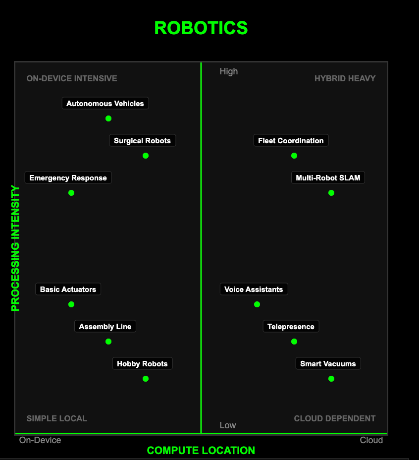 Cloud Dependent (Bottom Right): This quadrant is shrinking rapidly. Legacy systems and some specialized coordination tasks still require network connectivity, but the trend is clear - as edge compute becomes more powerful and affordable, fewer robotics applications justify the latency and reliability risks of cloud dependence.
