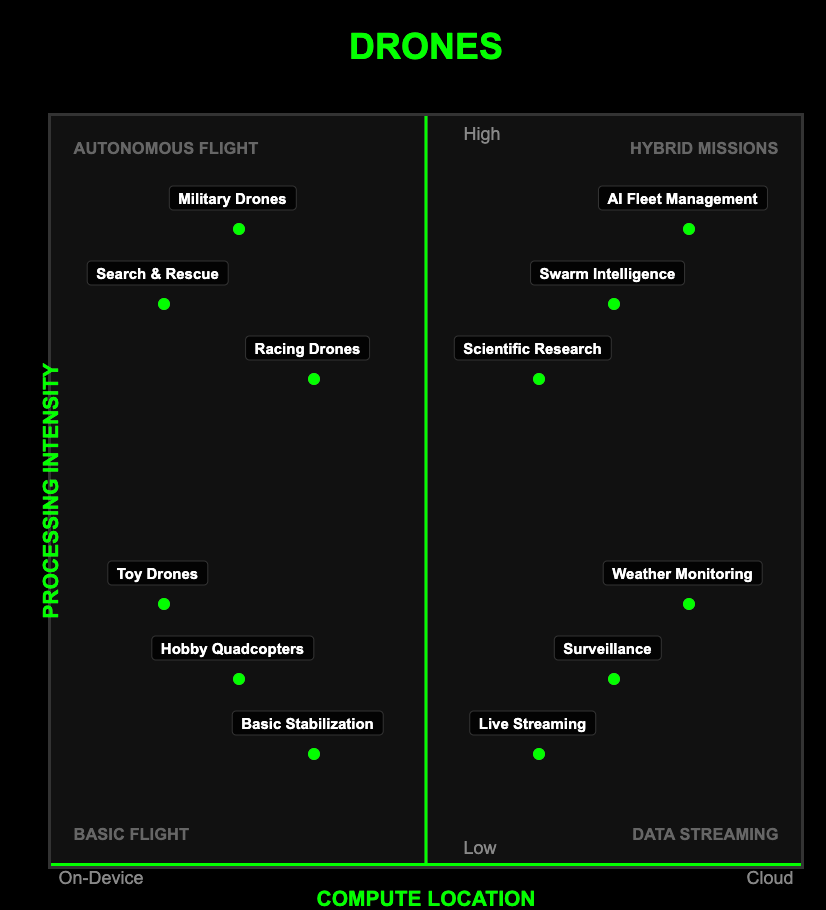 Hybrid Missions (Top Right): Advanced commercial applications like swarm intelligence and AI fleet management split their brains between sky and ground. The drone handles immediate flight safety and basic navigation locally, while coordinating with ground systems for complex mission planning, traffic management, and collaborative behaviors. Think delivery drones that need to navigate local obstacles instantly but optimize routes through cloud-based traffic systems.